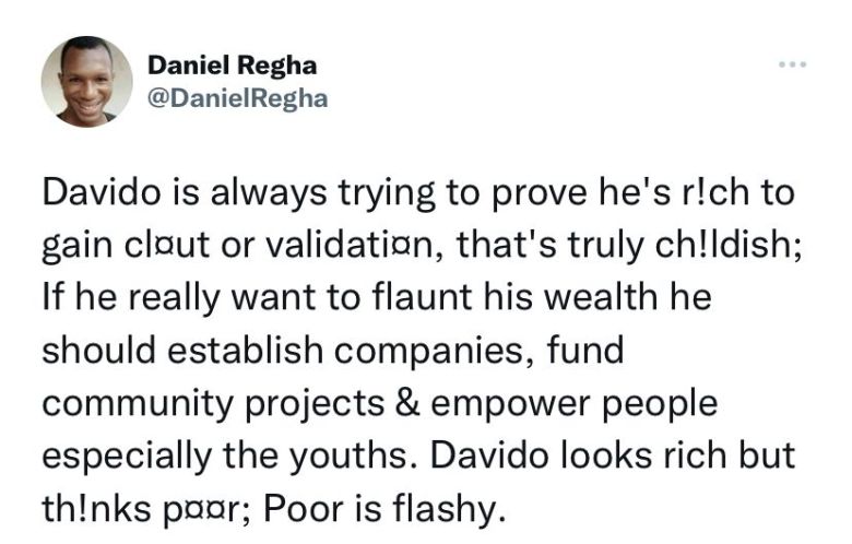 “Davido is always trying to prove he’s r!ch to gain cl¤ut or validati¤n, that’s truly ch!ldish; If he really want to flaunt his wealth he should establish companies, fund community projects & empower people especially the youths. Davido looks rich but th!nks p¤¤r; Poor is flashy.”