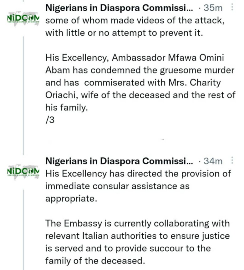 The statement adds that the Nigerian Ambassador to Italy, Mfawa Omini Abam, has condemned the killing and the embassy is currently collaborating with relevant Italian authorities to ensure justice is served and to provide succor to the family of the deceased.